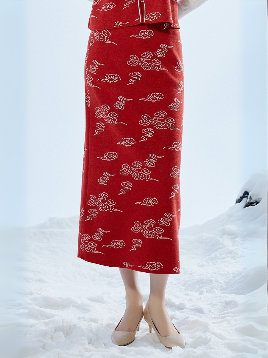 Wrap yourself in vibrant color and auspicious symbolism with this stunning knit skirt from GUZHI. Rendered in a celebratory red hue, this piece is crafted from a comfortable, high-quality jacquard knit and features an all-over pattern of traditional “Auspicious Clouds” (祥云) in a beautiful contrasting white.