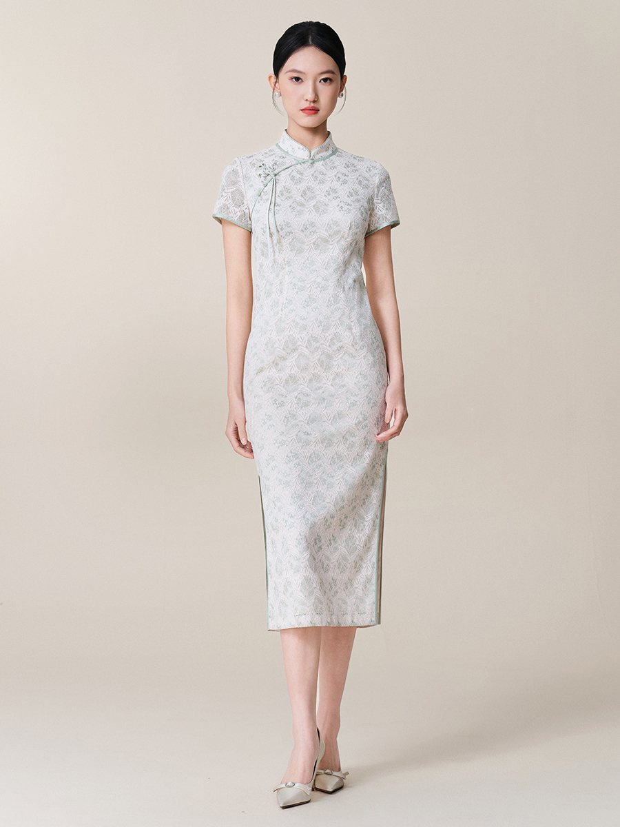 The design is beautifully highlighted by a delicate, contrast piping in a soft green hue, which expertly outlines the stately mandarin collar, the classic diagonal placket, the short cap sleeves, and the high side slit. This thoughtful detail adds a graceful definition to the dress’s clean lines.
