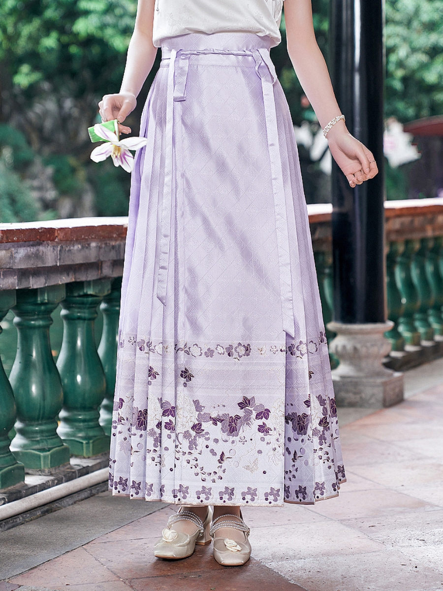 Step into a waking dream with this enchanting Hanfu skirt from GUZHI. Styled in the traditional “Mamianqun” silhouette, this piece is rendered in a beautiful soft lilac jacquard and adorned with a breathtakingly romantic print.
